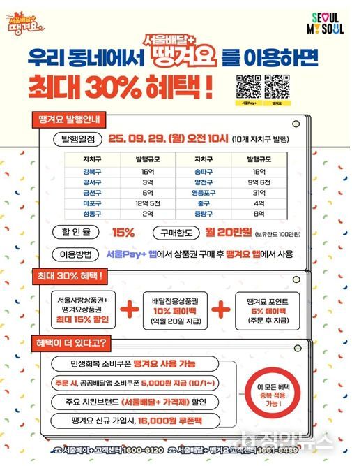 ' 29일(월)부터 ‘자치구 배달전용상품권’ 110억 규모 발행… ‘서울페이+’ 앱에서 15% 할인 판매'