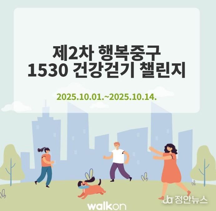 정안뉴스 황정혜 기자 | 부산 중구는 관내 중구민과 직장인을 대상으로 10월 1일부터 10월 14일까지 걷기 앱 워크온을 활용한‘제2차 행복 중구, 1530 건강걷기 챌린지’를 운영한다