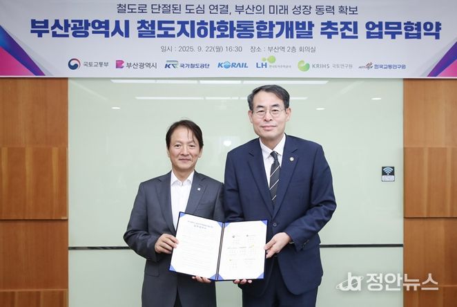 정안뉴스 황정혜 기자 | 부산시는 오늘(22일) 오후 4시 30분 부산역 2층 회의실에서 국토교통부, 한국철도공사, 국가철도공단, 한국토지주택공사, 국토연구원, 한국교통연구원 등과 함께 '부산광역시 철도지하화 통합개발 추진 업무협약'을 체결했다고 밝혔다.