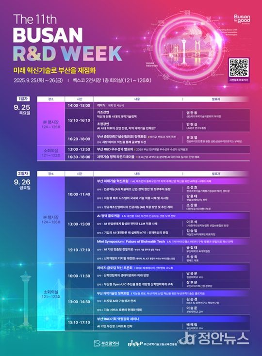 정안뉴스 황정혜 기자 | 부산시는 오는 9월 25일부터 26일까지 이틀간 벡스코 제2전시장에서 '제11회 부산 연구개발(R·D) 주간' 행사를 개최한다고 밝혔다.