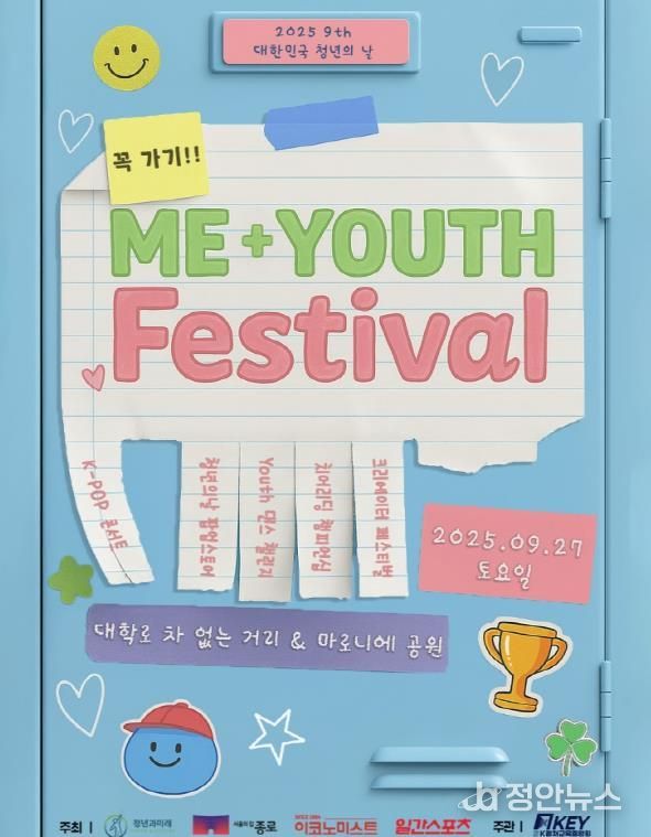 정안뉴스 안정주 기자 | 종로구는 9월 27일 10시부터 21시까지 대학로 대로변(혜화역 1번 출구~서울대병원 입구)에서 '제9회 대한민국 청년의 날' 행사를 개최한다.