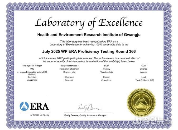 정안뉴스 안정주 기자 | 광주광역시 보건환경연구원이 최근 미국 환경자원협회(ERA)가 주관한 수질분야 국제 숙련도시험에서 전 항목 ‘만족(Satisfactory)’ 판정을 받아 ‘2025 최우수 분석기관(Laboratory of Excellence)’으로 선정됐다.