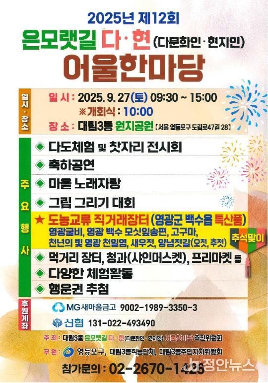 같은 날 오전 9시 30분부터 원지 어린이공원에서는 ‘제12회 은모랫길 다‧현 어울한마당’ 축제가 개최된다. 대림3동의 옛 지명인 ‘은모랫길’을 활용해 원주민들의 향수를 불러일으키고, 다문화 주민이 지역을 이해하며 함께 어울리는 뜻깊은 시간을 갖는다.