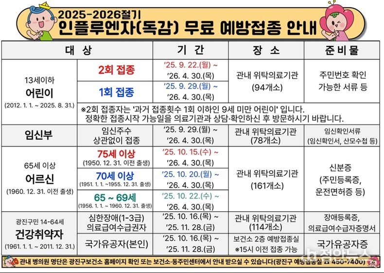 정안뉴스 안정주 기자 | 광진구는 겨울철 호흡기 감염병 확산을 예방하고 구민 건강을 보호하기 위해 인플루엔자 무료 예방접종을 실시한다.