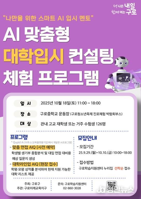정안뉴스 안정주 기자 | 구로구가 10월 18일 오전 11시부터 구로중학교 운동장에서 AI와 함께하는 대학 입시 상담(컨설팅)을 개최한다고 밝혔다.