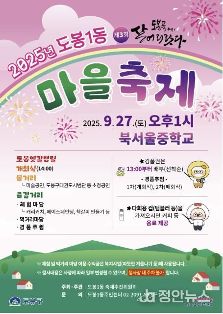 정안뉴스 안정주 기자 | 서울 도봉구 도봉1동이 오는 9월 27일 오후 1시 북서울중학교에서 도봉1동 마을축제 ‘제3회 도봉골에 살어리랏다’를 개최한다.