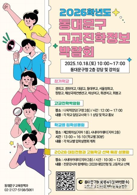 정안뉴스 안정주 기자 | 서울 동대문구는 오는 10월 18일 토요일 오전 10시부터 오후 5시까지 구청 내 다목적 강당, 제2회의실, 사내아카데미에서'2026학년도 고교 진학정보 박람회'를 개최한다고 밝혔다.