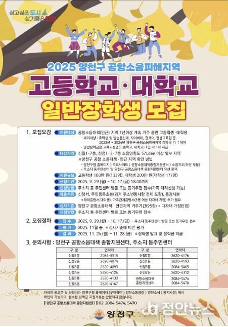 한편, 양천구는 공항소음 피해지역 학생들의 학습권 보호와 피해보상 대책의 일환으로 장학금 제도를 운영해오고 있으며, 현재까지 총 1,700여 명에게 약 25억 원의 장학금을 지원했다.