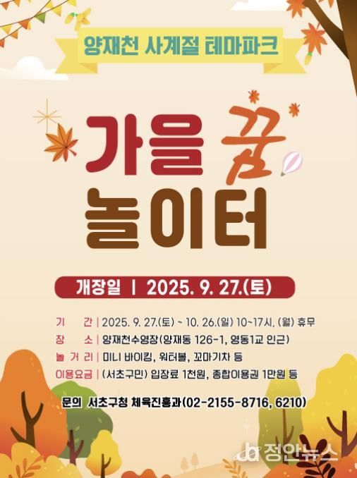 정안뉴스 안정주 기자 | 서울 서초구는 지난 여름 큰 사랑을 받았던 양재천 수영장을 가을을 맞아 오는 27일부터 어린이 테마파크인 ‘가을꿈놀이터’로 운영한다고 밝혔다.
