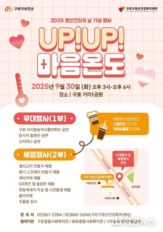정안뉴스 안정주 기자 | 구로구가 9월 30일 오후 3시부터 6시까지 구로거리공원(제1공원)에서 ‘2025 정신건강의 날’ 기념행사를 개최한다.