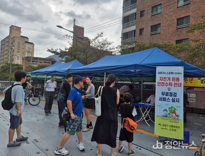 정안뉴스 황정혜 기자 | 부산시 금정구는 지난 24일, 도시철도 1호선 온천장역 4번 출구 옆 북측 공영주차장 내에 있는 금정구 공영자전거 대여소에서 주민들의 안전한 자전거 이용을 위해 `자전거 무료 점검·수리 서비스'를 실시했다.