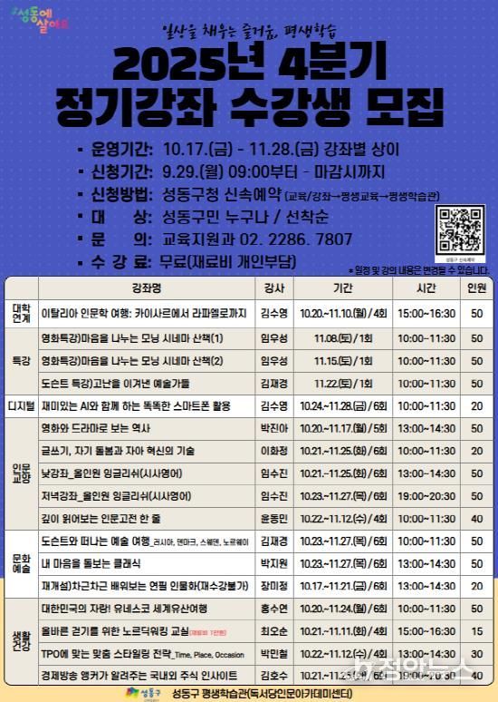 정안뉴스 안정주 기자 | 서울 성동구가 2025년 4분기 평생학습관 정기강좌 수강생을 오는 9월 29일(월) 오전 9시부터 성동구청 누리집(홈페이지) 신속예약에서 선착순으로 모집한다.