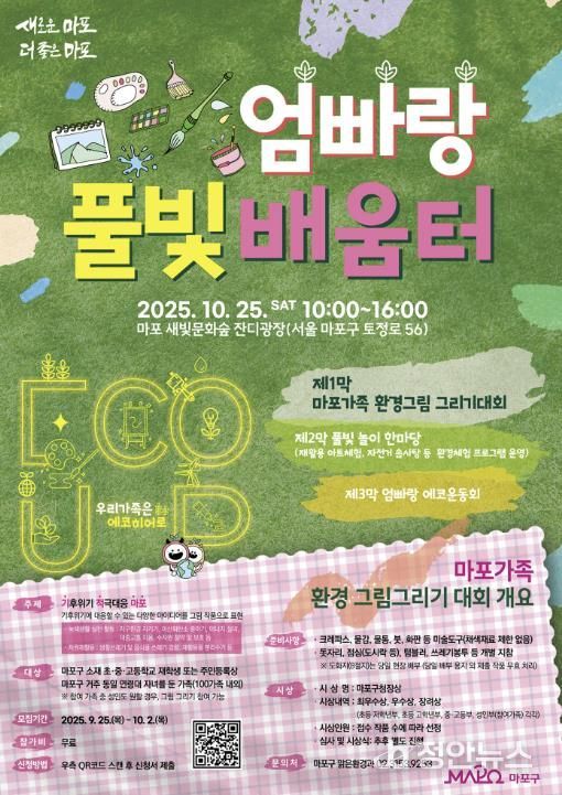 ‘마포 엄빠랑 풀빛배움터’는 마포새빛문화숲 잔디광장(토정로 56)에서 10월 25일 오전 10시부터 열리며, ‘우리 가족은 에코 히어로’라는 부제로 진행될 예정이다.