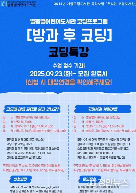 정안뉴스 안정주 기자 | 인천 계양구립별똥별어린이도서관은 2025년부터 실시된 초·중등학교 코딩교육 의무화에 따라 지역 아동들의 디지털 역량 강화를 위해 10월부터 코딩 특화사업 ‘방과 후 코딩’을 운영한다고 밝혔다.