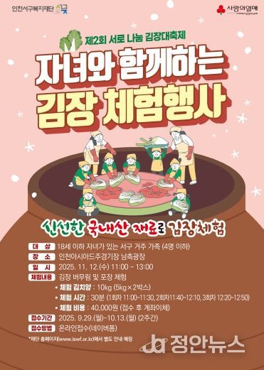 정안뉴스 안정주 기자 | 인천 서구가 11월 12일 인천아시아드주경기장 남측광장에서 제2회 서로 나눔 김장 대축제를 개최한다.