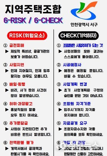 서구는 지역주택조합의 전국적 파산 사례와 사업 정체로 인한 피해가 만연함에 따라 구민의 이해도를 높이고 보다 신중하게 사업에 참여할 수 있도록 지원하고자 조합의 위험 요소와 가입 전 확인해야 할 주요 사항을 담은 ‘지역주택조합 6-RISK / 6-CHECK’를 소식지와 안내문 등을 통해 지속적으로 배포할 계획이다.