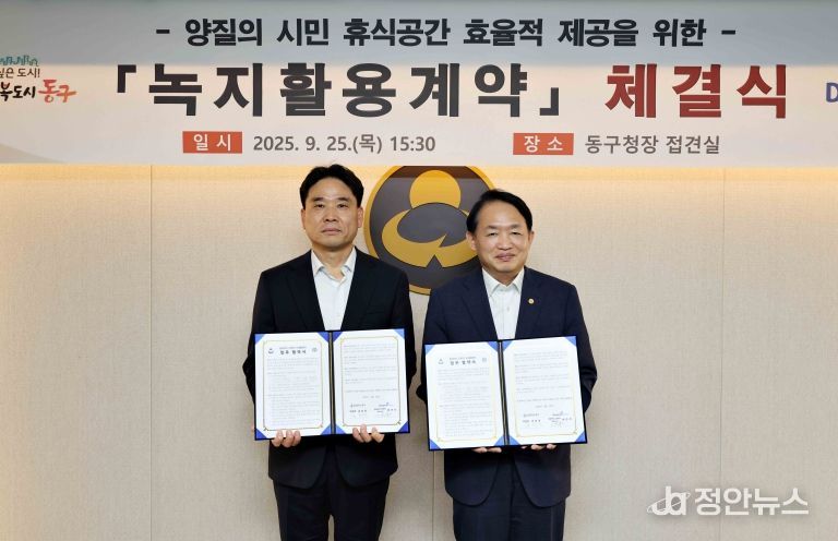 정안뉴스 안정주 기자 | 인천 동구는 지난 25일 동원로엑스㈜(인천㈜ 대표이사 최안석)와‘녹지활용계약’을 체결했다고 밝혔다. 인천 최초로 진행된 이번 계약은 민간기업이 소유한 사유지를 주민에게 열린 녹지로 제공하는 새로운 방식의 민관 협력 모델이다.