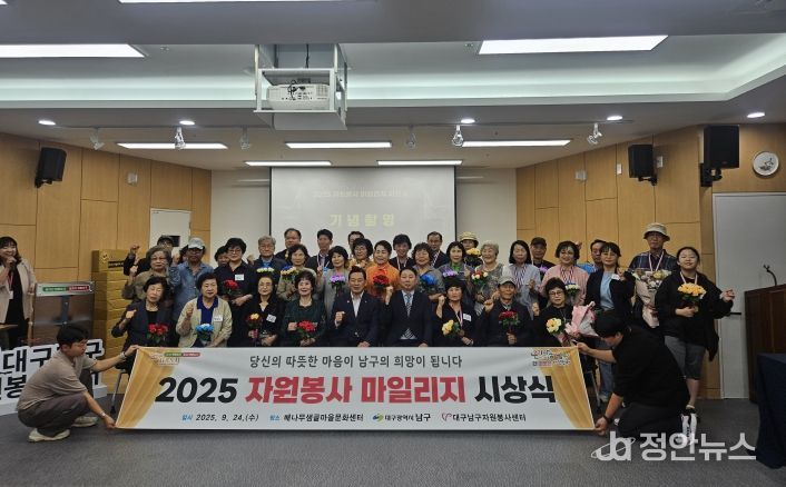 정안뉴스 안정주 기자 | 대구 남구는 대구 남구자원봉사센터(센터장 이창지)와 함께 지난 9월 24일, '2025 자원봉사 마일리지 시상식'을 열고 한 해와 오랜 세월 동안 지역사회를 위해 헌신해 온 우수 자원봉사자들에게 인증메달, 공로패, 핸드프린팅을 수여했다.
