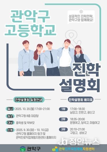 정안뉴스 안정주 기자 | 관악구가 중학생과 학부모를 대상으로 오는 10월 20일 개최하는 ‘관악구 고등학교 진학설명회’ 참가자를 모집한다.