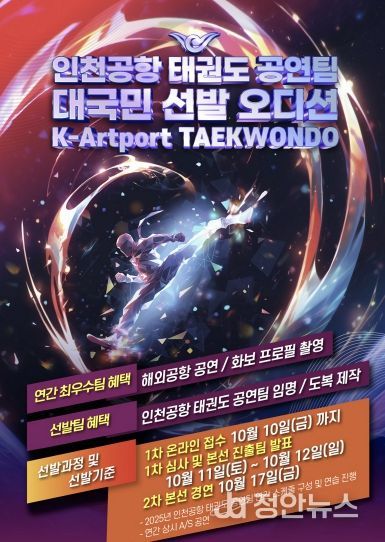 정안뉴스 안정주 기자 | 인천국제공항공사는 인천공항에서 진행되는 태권도 상설공연인 ‘2025-2026 인천공항 태권도 상설공연’에 참여할 태권도 전문 공연팀을 공개 모집한다고 28일 밝혔다.