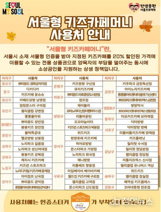 정안뉴스 안정주 기자 | 열흘 안팎의 긴 추석연휴를 앞두고 아이들과 양육자가 보다 부담 없는 가격으로 키즈카페에서 즐거운 연휴를 보낼 수 있도록 서울시가 20% 할인 혜택이 있는 ‘서울형 키즈카페머니’ 11억 원을 추가 발행한다고 밝혔다.
