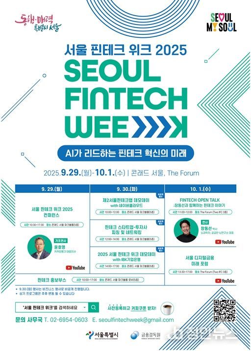 정안뉴스 안정주 기자 | 서울시는 디지털금융허브 경쟁력 강화를 위해 오는 9월 29일부터 10월 1일까지 3일간 여의도(콘래드 서울, 더포럼 등)에서 ‘서울 핀테크 위크 2025’를 개최한다고 밝혔다.