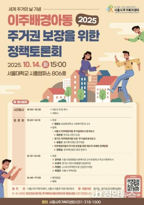 정안뉴스 안정주 기자 | 시흥시주거복지센터는 오는 10월 14일 오후 3시, 서울대학교 시흥캠퍼스 806호에서 ‘이주배경아동 주거권 보장을 위한 정책토론회’를 개최한다.