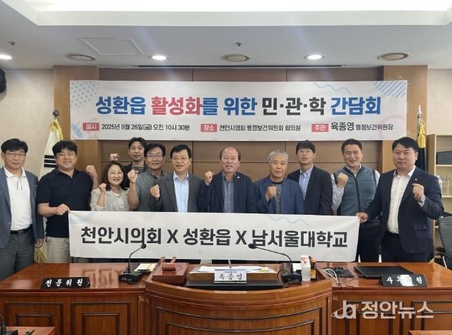 정안뉴스 황도연 기자 | 천안시의회 육종영 행정보건위원장은 26일 ‘성환읍 활성화를 위한 민·관·학 간담회’를 주재하고, 성환 도시재생혁신지구 지정 이후의 현황과 발전 전략을 공유하는 한편 지역대학 연계 사업과 민·관·학 거버넌스 강화 방안을 논의했다.