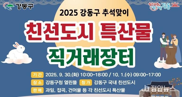 정안뉴스 안정주 기자 | 강동구는 2025년 추석을 맞이해 오는 9월 30일과 10월 1일 이틀간 강동구청 열린뜰에서 ‘친선도시 특산물 직거래장터’를 개최한다고 29일 밝혔다.