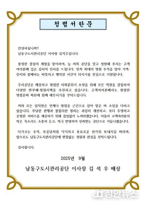 정안뉴스 안정주 기자 | 인천시 남동구 도시관리공단은 청렴 문화 정착을 위해 공사, 용역, 물품 관련 업체와 전 직원에게 ‘청렴 서한문’을 발송했다고 29일 전했다.