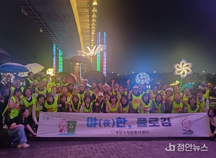 정안뉴스 안정주 기자 | 인천 계양구자원봉사센터는 지난 24일 저녁, ‘계양아라온 아트웨이(빛의 거리 3단계)’와 ‘가을꽃 국화축제’가 열리는 현장에서 자원봉사자 74명과 함께 ‘야(夜)한 플로깅’ 봉사활동을 진행했다.