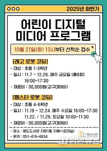 정안뉴스 황정혜 기자 | 영도도서관에서 어린이복합문화공간의 디지털 교육환경을 기반으로 관내 어린이들의 디지털 역량 강화와 창의력 향상을 위한 ‘2025년 하반기 어린이 디지털 미디어 프로그램’을 운영한다.