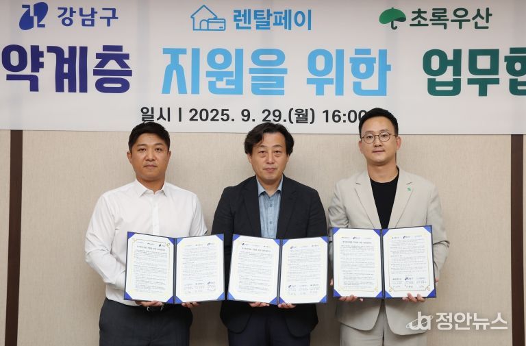 정안뉴스 안정주 기자 | 꿈이 모이는 도시, 미래를 그리는 강남구가 9월 29일 렌탈페이, 초록우산과 함께 주거취약계층 지원을 위한 3자간 업무협약(MOU)을 체결했다.