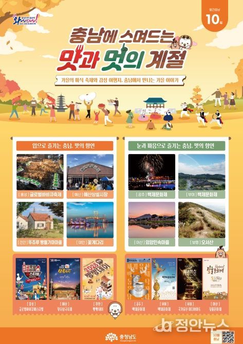 정안뉴스 황도연 기자 | 충남도가 ‘2025∼2026 충남 방문의 해’를 맞아 운영 중인 ‘월간 충남’을 통해 ‘충남에 스며드는 맛과 멋의 계절’이라는 주제로 10월 가볼 만한 도내 여행지를 안내한다.