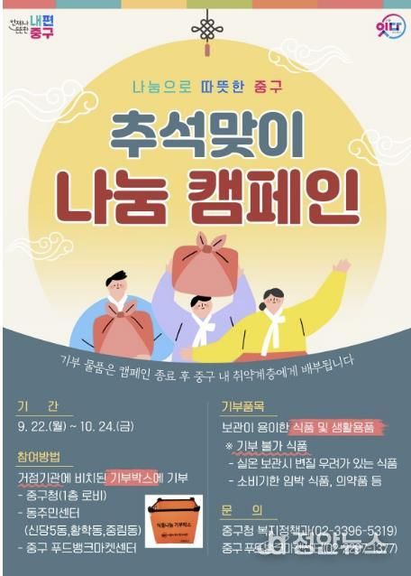 정안뉴스 안정주 기자 | 서울 중구가 다가오는 추석 명절을 앞두고 어려운 이웃을 돕기 위해 '2025 추석맞이 나눔 캠페인'을 진행한다. 이번 캠페인은 지난 22일부터 오는 10월 24일까지 4주간 이어지며, 주민들의 따뜻한 동참으로 풍성한 명절 나눔을 실천할 예정이다.