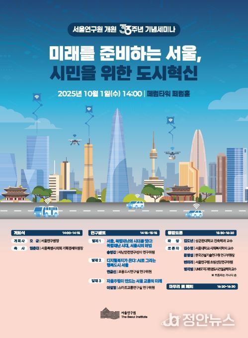 정안뉴스 안정주 기자 | 서울연구원은 10월 1일 오후 2시, 페럼타워 페럼홀에서 '미래를 준비하는 서울, 시민을 위한 도시혁신'을 주제로 개원 33주년 기념세미나를 개최한다.