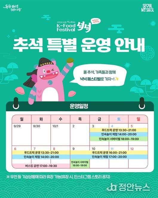 정안뉴스 안정주 기자 | 전 세계를 휩쓴 케데헌(케이팝데몬헌터스) 열풍이 한국 음식 문화까지 확산되는 가운데, 서울시는 이를 한자리에서 즐길 수 있는 ‘K-푸드 페스티벌 넉넉’을 올 추석 연휴 동안 확대 운영하며, 명절 분위기를 더하는 전통놀이와 공연 프로그램을 선보인다고 밝혔다.