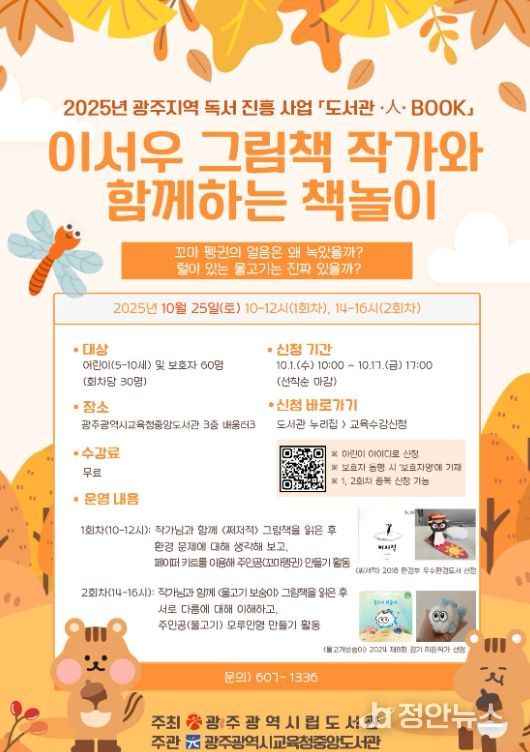 정안뉴스 안정주 기자 | 광주광역시교육청중앙도서관은 오는 10월 25일 본관 3층 배움터3에서 ‘이서우 그림책 작가와 함께하는 책놀이’ 프로그램을 운영한다.
