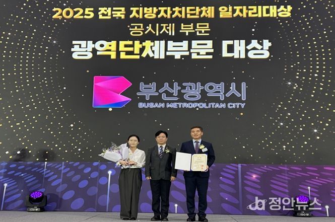 정안뉴스 황정혜 기자 | 부산시는 오늘(30일) 오후 2시 청주오스코에서 열린 '2025 전국 지방자치단체 일자리대상' 시상식에서 '공시제 부문' 광역단체 대상(국무총리상)과 '우수사업 부문' 우수상(장관상)을 각각 수상했다고 밝혔다.