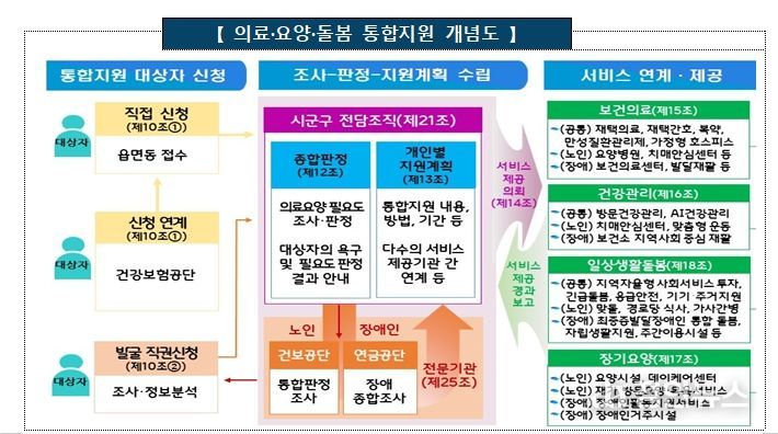 이러한 환경변화 및 요구에 대응하기 위해, 정부는 시범사업 등 통합돌봄의 제도화를 추진해 왔으며, 일상생활 수행에 어려움을 겪는 사람이 살던 곳에서 건강한 생활을 영위하도록 의료·요양·돌봄 서비스를 통합·연계하는 '의료·요양 등 지역 돌봄의 통합지원에 관한 법률(돌봄통합지원법)'이 ’24년 3월 제정되어 내년 3월 전국적인 본사업 시행을 앞두고 있다.