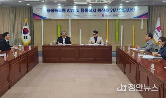 정안뉴스 황정혜 기자 | 부산시는 동물등록률 향상 및 동물복지 증진을 위해 어제(30일) 오전 10시 시청 26층 회의실에서 '㈜유니온바이오메트릭스'와 업무협약(MOU)을 체결했다고 밝혔다.