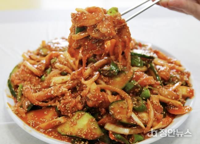 일명 ‘갱개미’라고도 불리는 ‘간재미’는 생김새가 가오리와 비슷하지만 크기가 작고 맛도 홍어에 견줄만한 심해성 어종으로 보령 9미 중 하나로 꼽힐 만큼 그 맛이 뛰어나다. 서해안 앞바다에서 갓 잡아 올린 간재미를 손질해 싱싱한 채소들과 함께 새콤달콤하게 버무려 낸 간재미 회무침 역시 진미로 통한다. 홍어 못지 않게 요소 성분이 많은 것으로 알려진 간재미는 홍어처럼 톡 쏘는 맛이나 생선 특유의 비린 맛이 없어 평소 회를 즐기지 않는 이들도 쉽게 입맛을 붙일 수 있다.