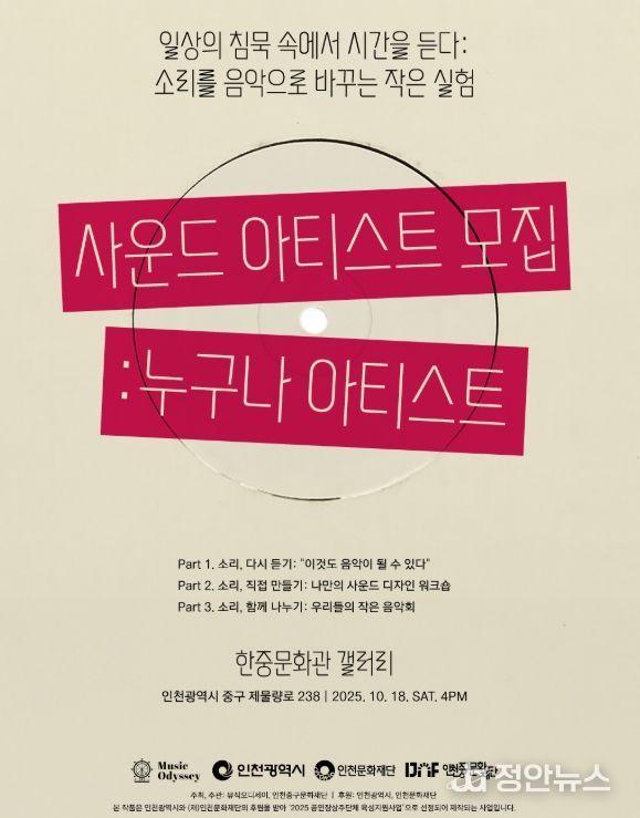 정안뉴스 안정주 기자 | (재)인천중구문화재단은 상주단체 ‘뮤직오디세이’의 시민참여 퍼블릭프로그램 〈일상의 침묵 속에서 시간을 듣다'에 함께할 참가자를 선착순 모집한다고 1일 밝혔다.