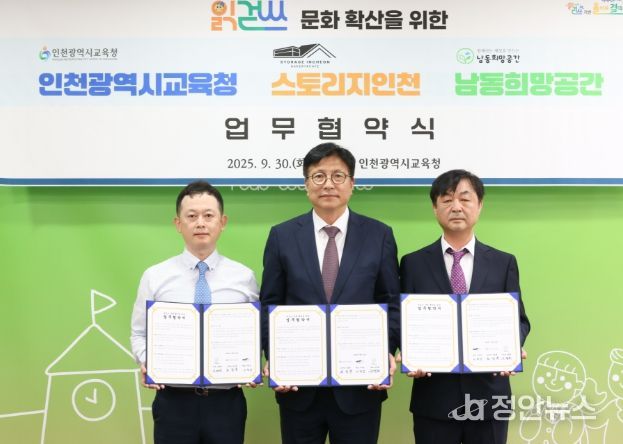정안뉴스 안정주 기자 | 인천광역시교육청은 9월 30일 ㈜월미하이랜드(대표 이덕성) 스토리지인천, 남동희망공간(대표 유병희)과 함께 ‘읽걷쓰’ 문화 확산을 위한 업무협약을 체결했다.