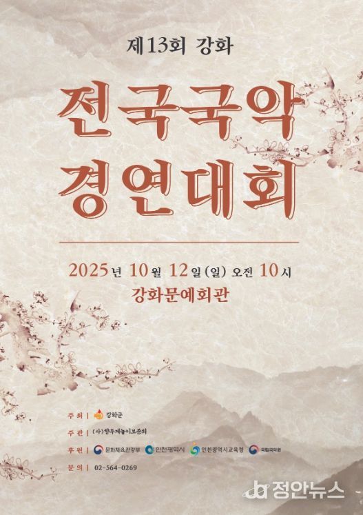 정안뉴스 안정주 기자 | 강화군은 오는 10월 12일 강화문예회관에서 ‘제13회 강화 전국 국악경연대회’를 개최한다고 밝혔다.