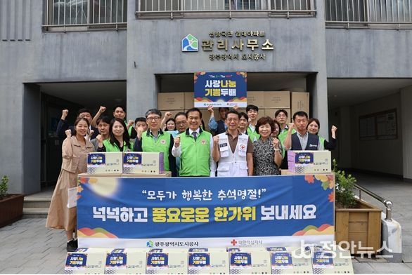 정안뉴스 안정주 기자 | 광주도시공사(사장 김승남)는 추석 명절을 맞아 지난 29일 한국적십자사 광주전남지사와 함께‘추석맞이 노사공동 사랑의 선물 전달 행사’를 진행했다고 밝혔다.