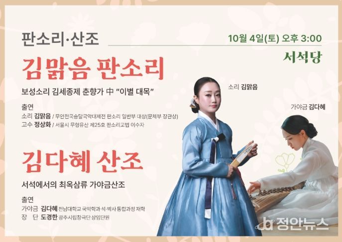 정안뉴스 안정주 기자 | 광주문화재단 전통문화관은 오는 10월 4일 오후 3시, 제21회차 토요상설공연을 선보인다.