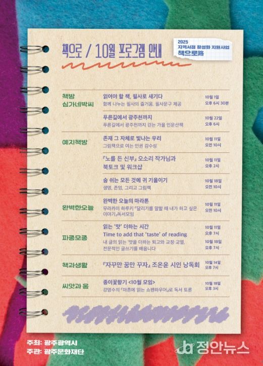 정안뉴스 안정주 기자 | 광주문화재단이 추진 중인 ‘2025 지역서점 활성화 지원사업 - 책으로(路)’가 독서의 계절 10월을 맞아 한층 다채로운 프로그램으로 시민들을 찾아간다.