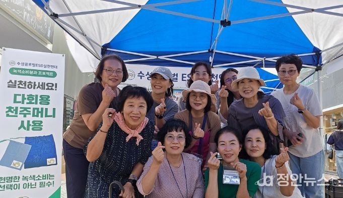 천주머니에는 수성구 캐릭터 ‘뚜비’ 라벨을 회원들이 직접 부착했으며, 시민들에게 배포하며 일회용 비닐봉투 사용을 줄이기 위한 홍보 활동을 전개했다.