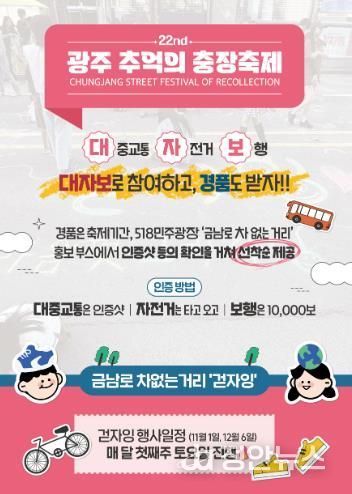 정안뉴스 안정주 기자 | 광주 동구는 오는 15일부터 5일간 금남로와 충장로 일원에서 열리는 제22회 광주 추억의 충장축제에서 ‘금남로 차 없는 거리’의 가치를 알리고 대자보 도시 정책에 시민 참여를 확대하기 위한 특별 홍보 이벤트를 진행한다고 밝혔다.